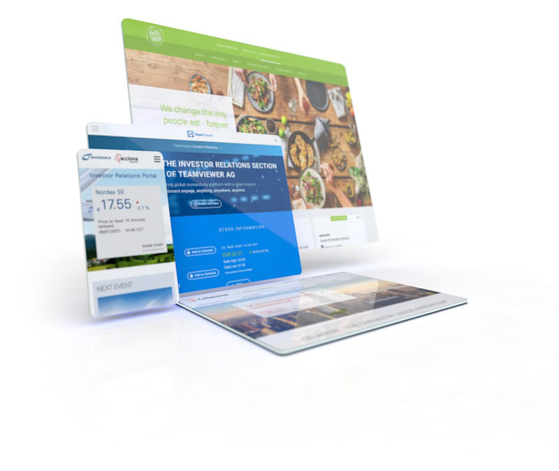 All our tools work as stand-alone solutions that your team can implement on your website. But you can also place the complete care of your IR website in our hands. With this comprehensive approach, we will generate a complete IR website featuring a full package of our tools. This IR website can be easily integrated into your corporate website. By reproducing your website’s existing corporate branding, visitors won’t recognize there is any outsourced component.With the IR Website package, you can receive maximum benefits: